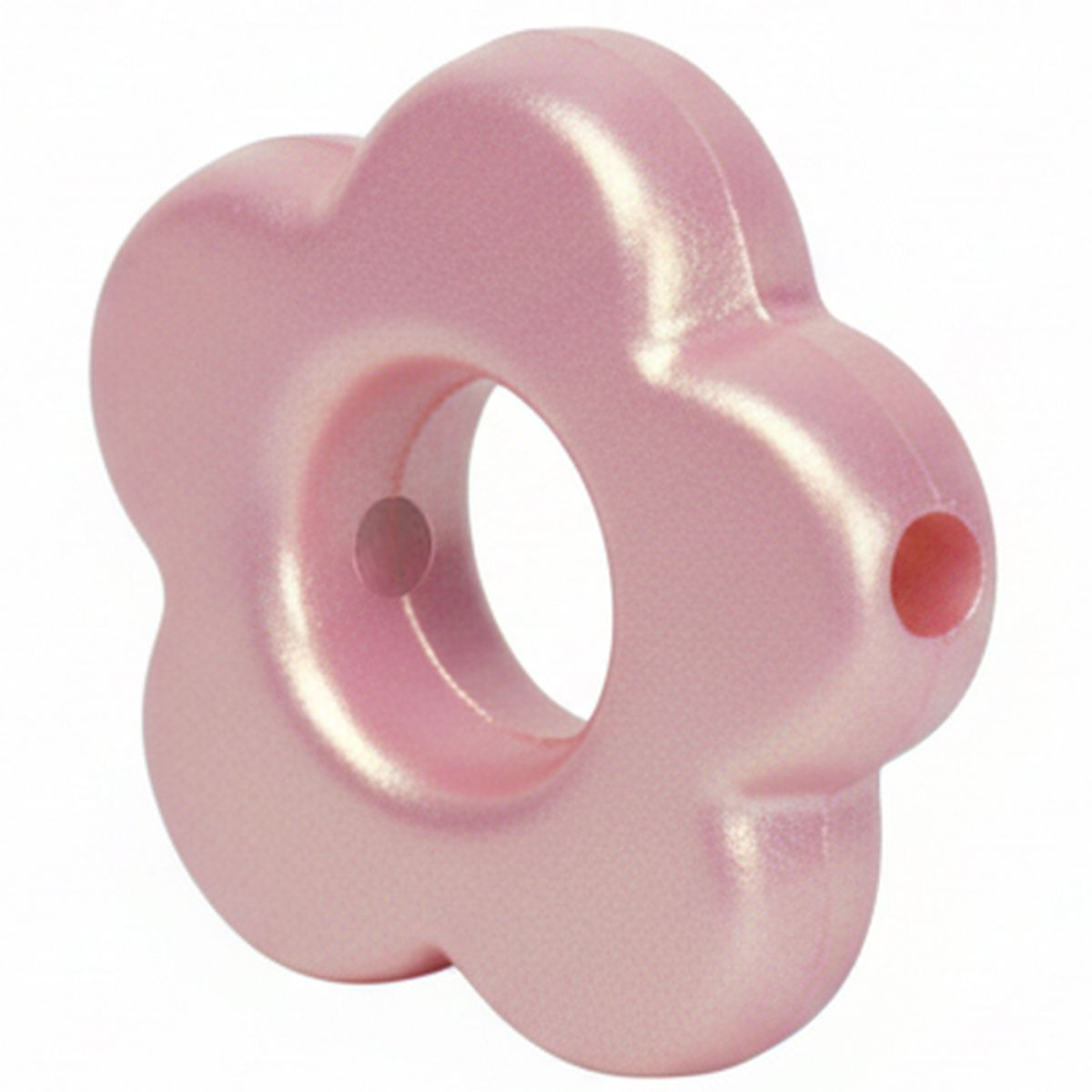 Koraliki plastikowe, wzór: kwiatki, średnica: 15 mm, średnica dziurki: 1 mm, grubość koralika: 35 mm, kolor: bladoróżowe. 20 g.