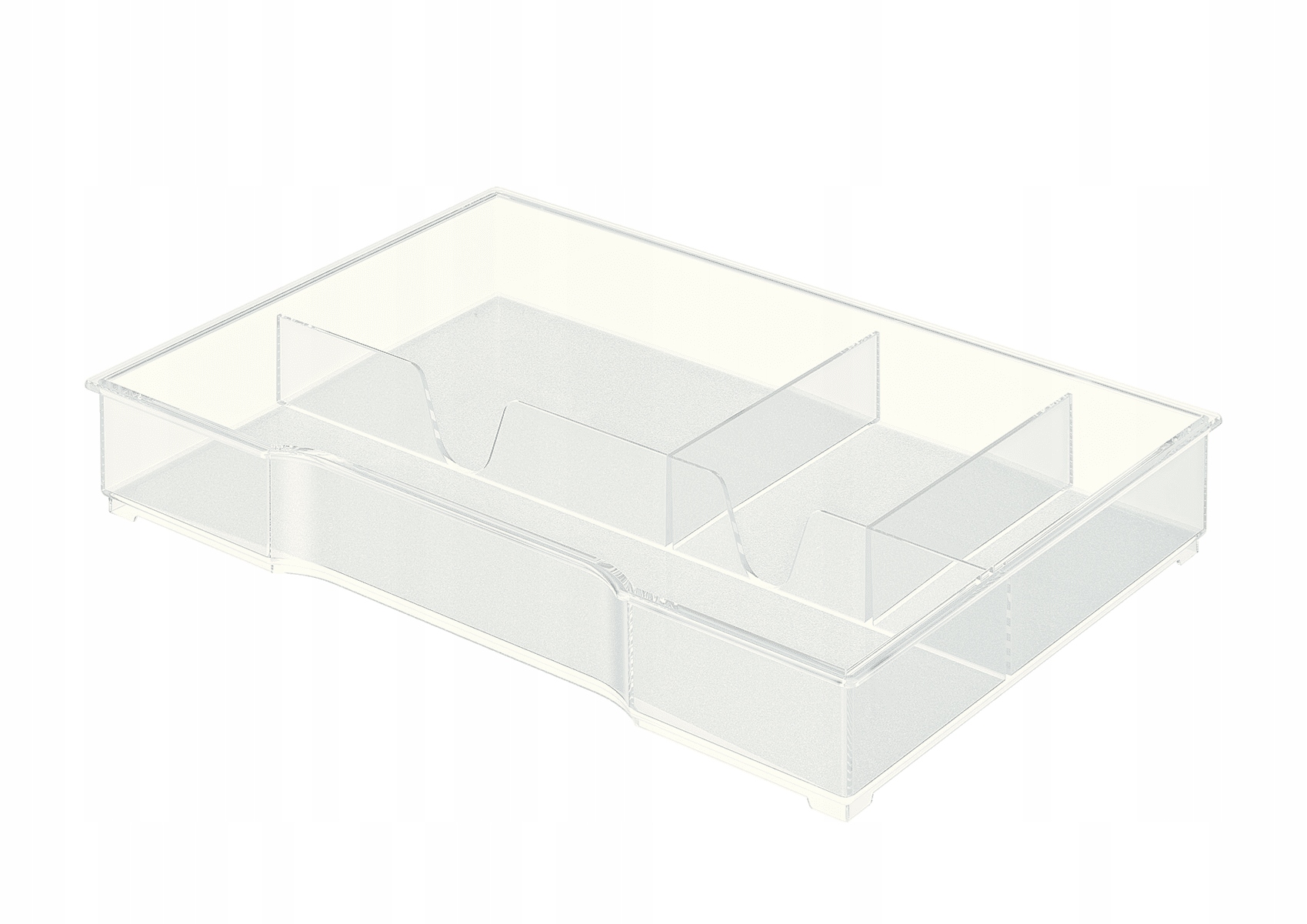 - Przezroczysty, blyszczący wygląd z teksturą na dnie oraz grawerowanymi symbolami pokazującymi mozliwe opcje przechowywania dla kazdej przegródki.